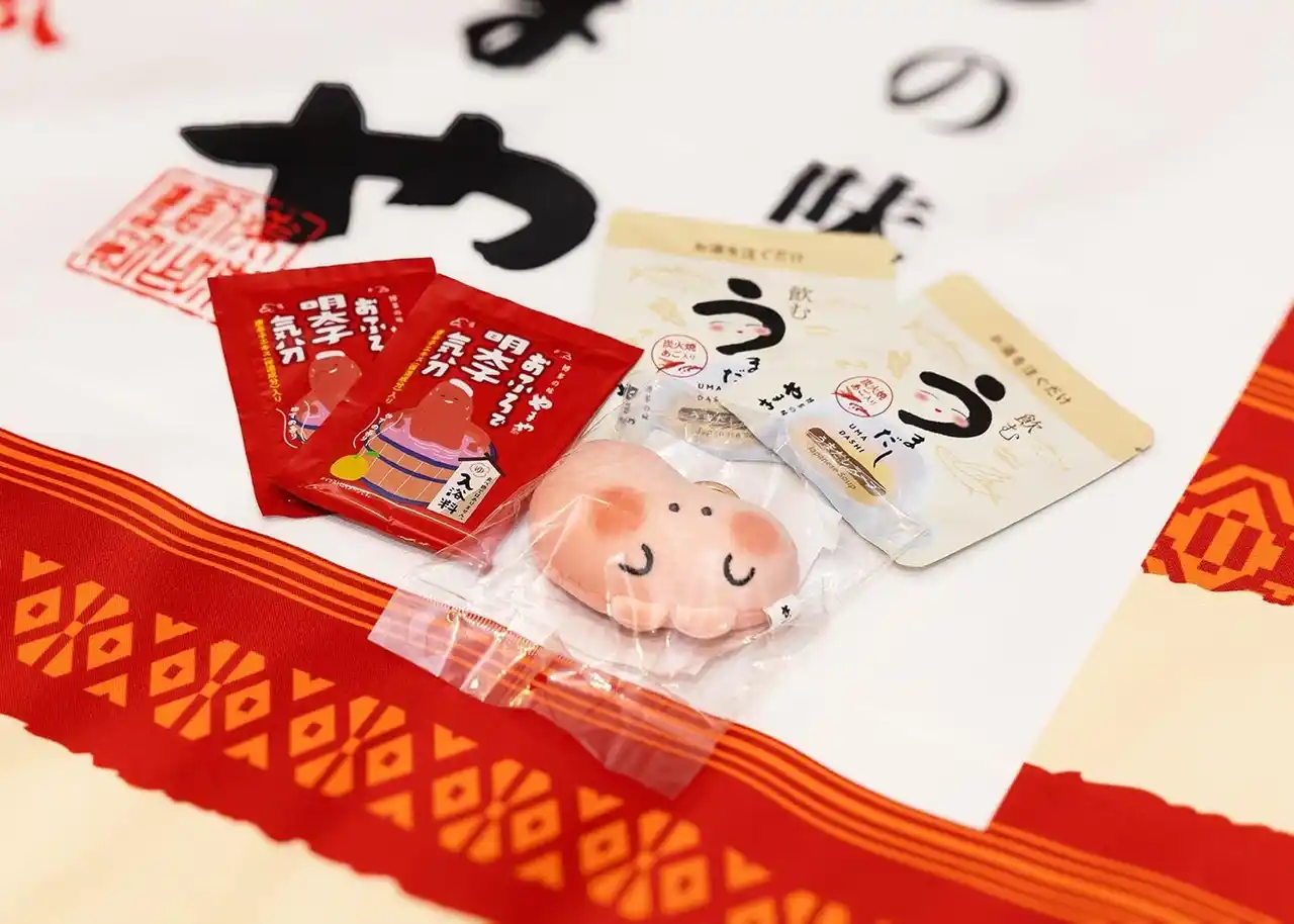 | また、ご宿泊のお客さまには、やまやの人気商品である6種類の厳選だし素材を黄金比率でブレンドした“うまだし”がお湯を注ぐだけで手軽に楽しめる「飲むうまだしスープ」をはじめ、漬け込み液「匠のたれ」に使われている4つの素材をイメージし、トウガラシエキスやマコンブエキス、酒粕エキスが入った、爽やかな柚子の香りの入浴料「おふろで明太子気分入浴料」、「やまやめんたいちゃんキーホルダー」をプレゼントいたします。 | |||||||||