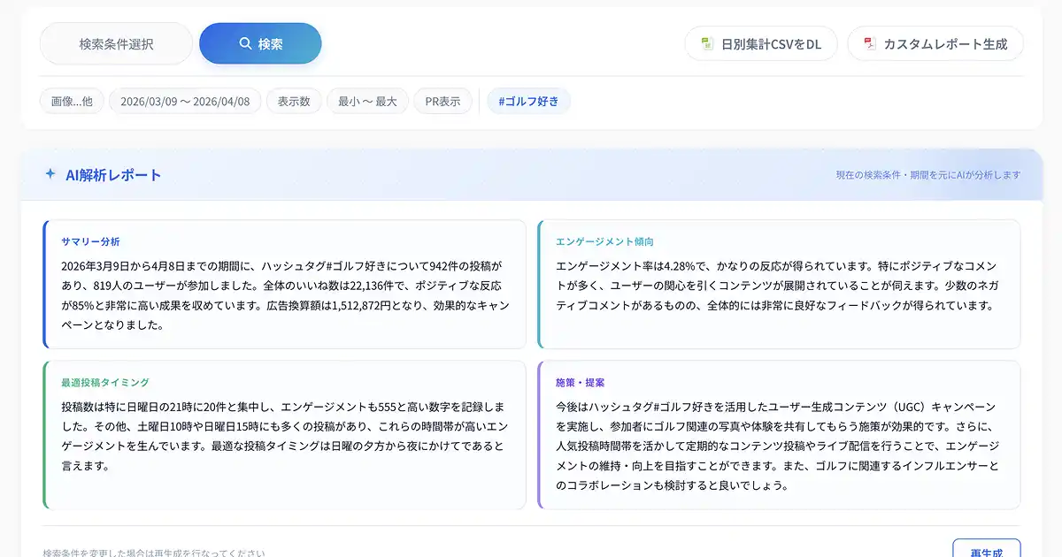 リニューアルと同時に、AIによるレポート自動生成機能を追加しました。蓄積した投稿データをボタン1つでAIが分析し、エンゲージメント傾向・改善ポイントをテキストで出力。そのままクライアント向け資料に貼り付けられます。 |
