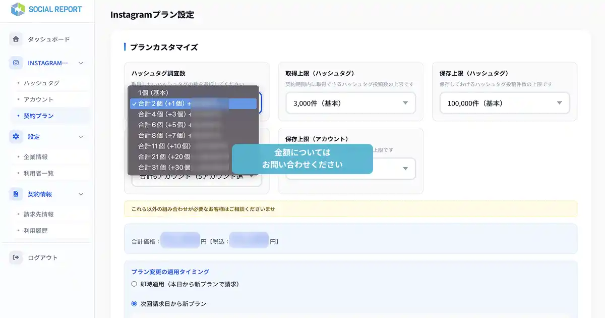 今回のリニューアルにあわせて、価格体系も見直しました。これまでは固定のプランから選ぶ形でしたが、新プランではハッシュタグ数・アカウント数などを顧客自身が必要な量に応じて組み合わせられる設計に変更しています。「使う機能だけ払う」という現場の感覚に合った価格設計です。 |