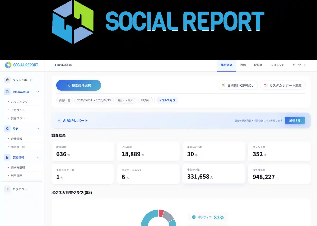 Instagram分析SaaS「hashout」を運営する株式会社hashout(本社:東京都豊島区/代表:落合匠)は、サービス名を「Social Report」に改め、管理画面を全面リニューアルしました。2,000社以上への導入を通じて蓄積したユーザーの声を軸に設計を根本から見直し、2026年4月15日より新バージョンの提供を開始します。 |