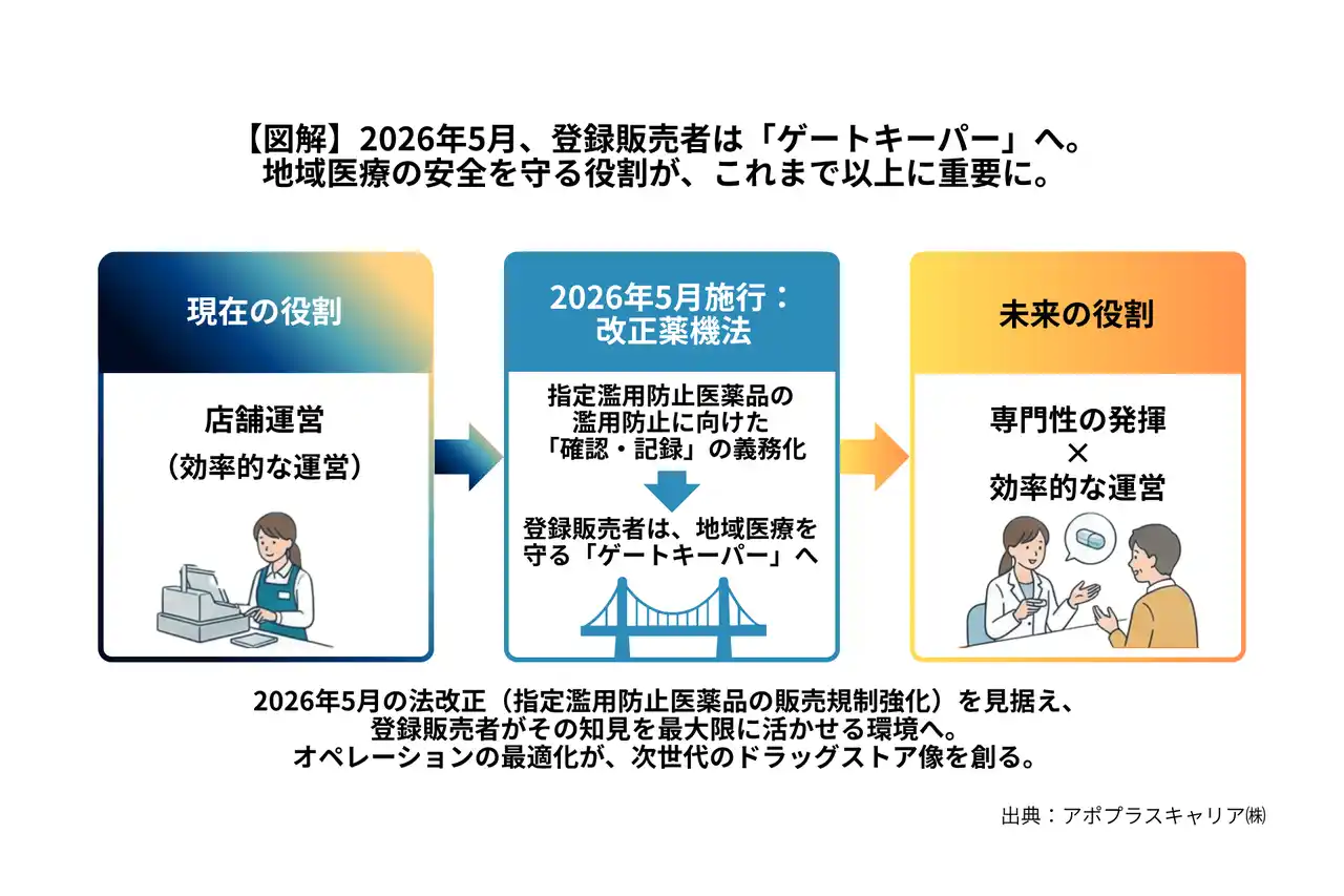 【図解】2026年5月、登録販売者の役割は「販売」から「管理・守護」へ。指定濫用防止医薬品の「確認・記録」が義務化され、法的責任が明確になる今、専門職がその知見を最大限に発揮できる「最適な運営」と「専門業務」の両立が、次世代のドラッグストア経営に不可欠となります。 |