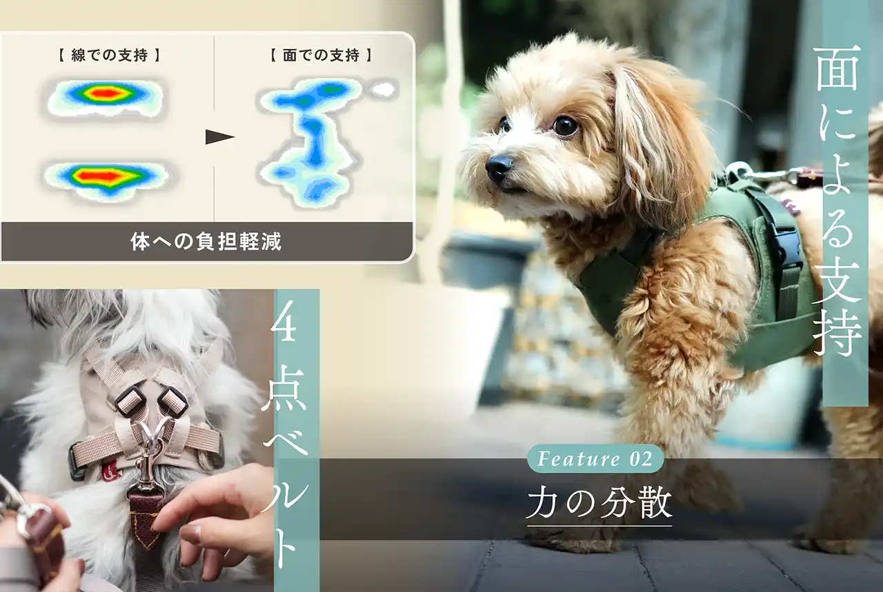 引っぱりで咳が出やすい子や、首の負荷に弱い子を想定して開発。特に小型犬は遺伝的に気管が弱い子が多いため、生涯、少しでも長くお散歩を楽しめるようにという想いを設計に込めました。 |