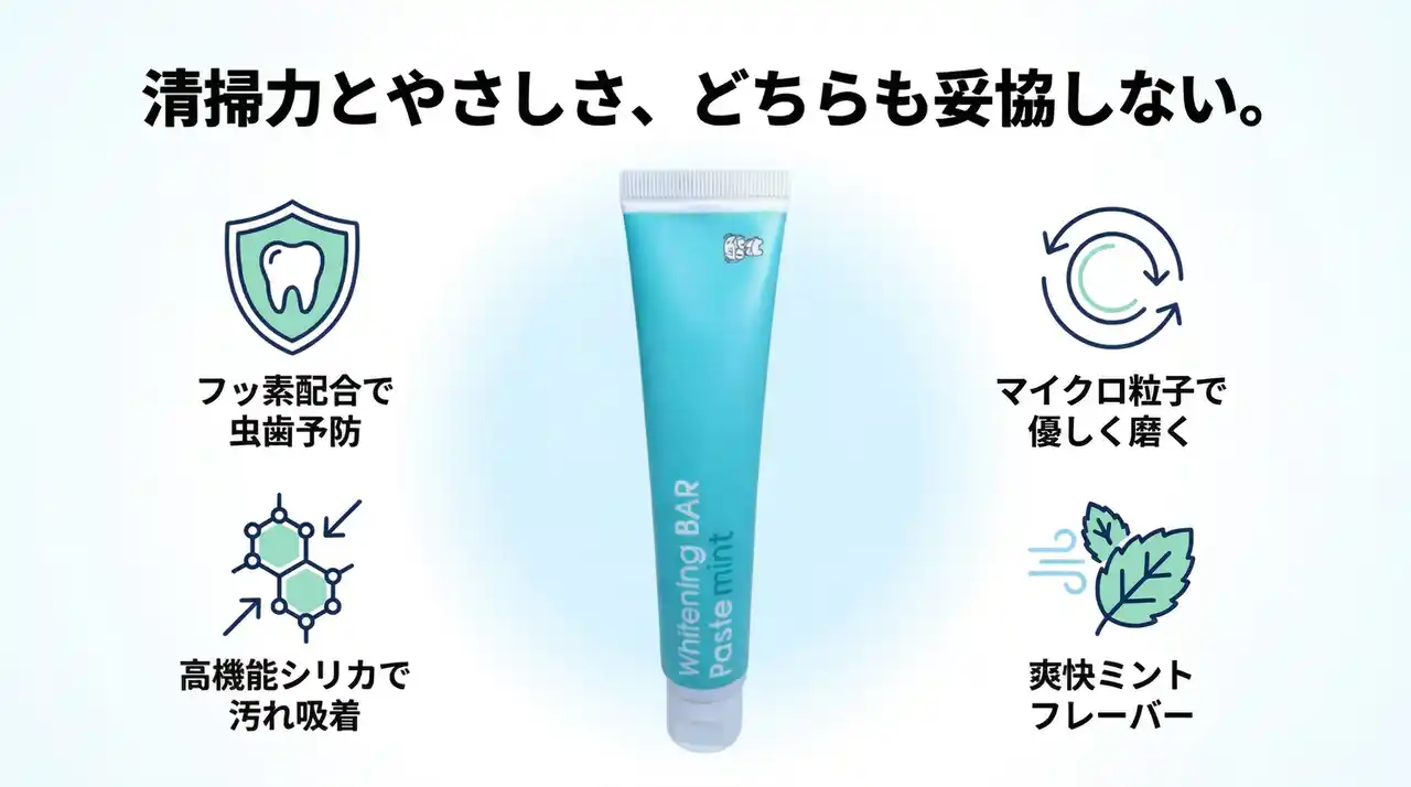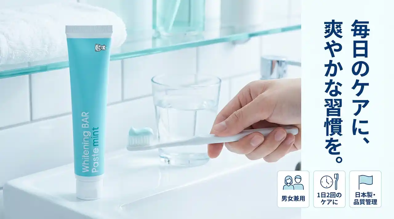 | その課題に向き合い、「毎日の歯みがきを前向きな習慣へ変える」ことを目的に開発されたのが「WhiteningBAR Paste Mint」です。 | |||