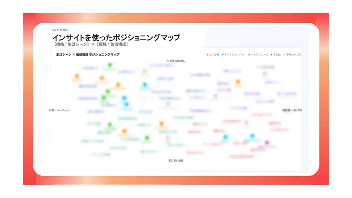 今回の分析により、個別調査では見えにくかったお酒やノンアルコール飲料に対する体系的なインサイトが可視化されたことは、大きな成果だと感じています。抽出されたインサイトやポジショニングマップは、社内における戦略や商品企画の議論において、今後活用できればと考えています。」 |