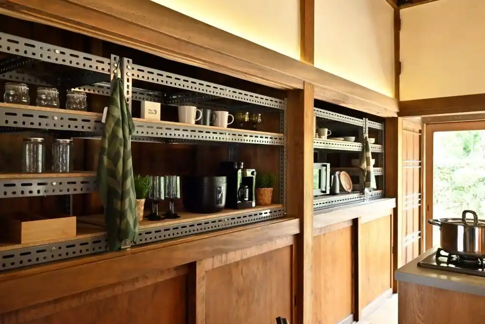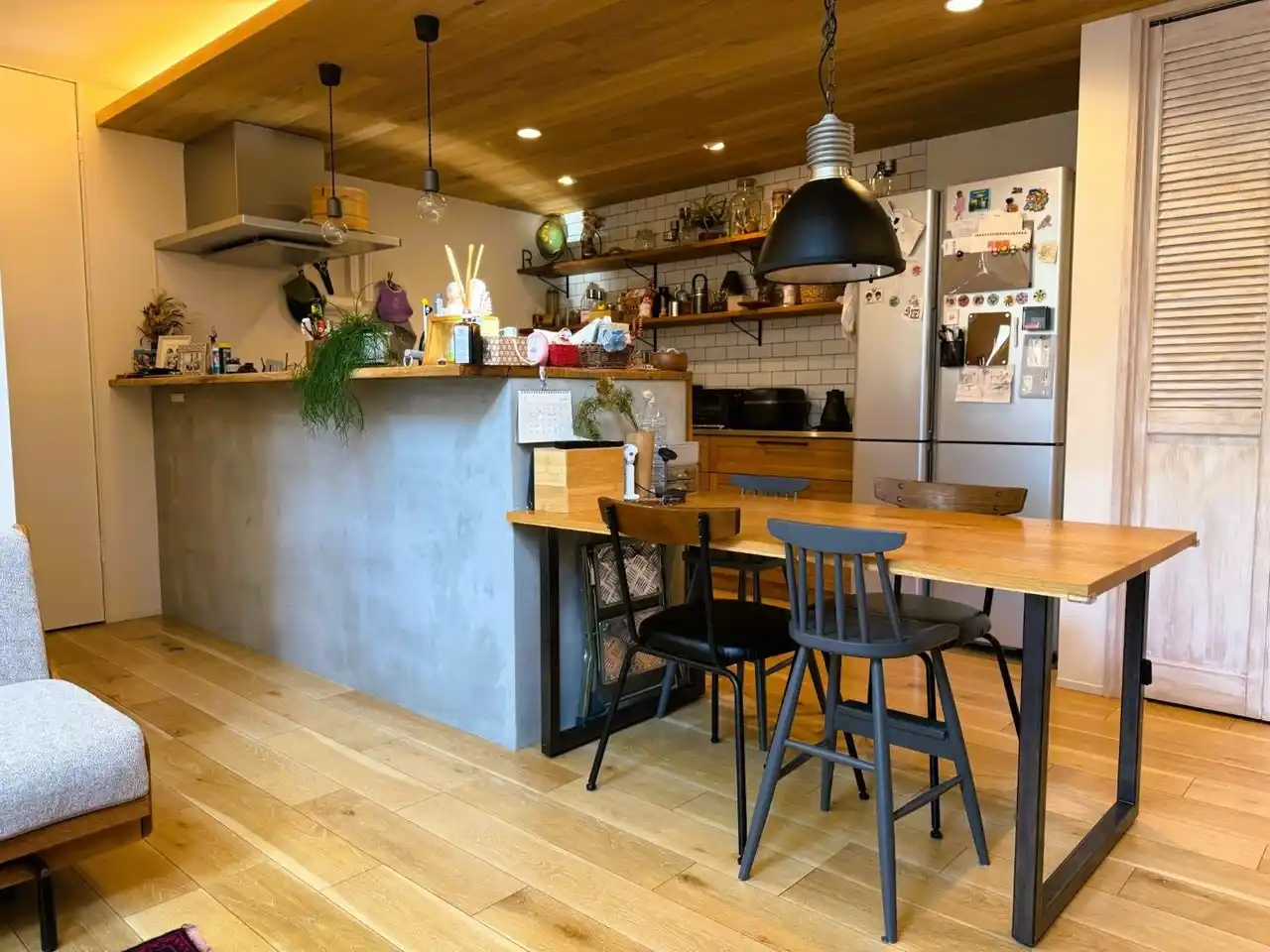 | また、キッチン背面の押入れは既存建具を活かしながら、スチールラックや有孔ボード(無塗装・塗装)の組み合わせにより、背景の切り替えが可能な仕様としています。 | |||||||||||