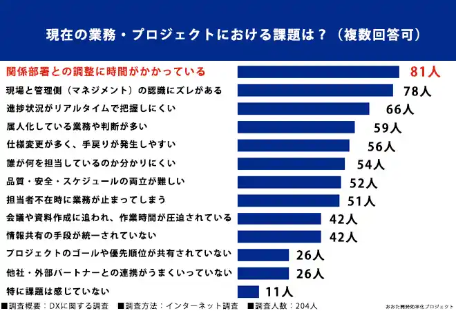 | 現場の業務・プロジェクトの課題「関係部署との調整に時間がかかっている」が81人で最多 | ||||