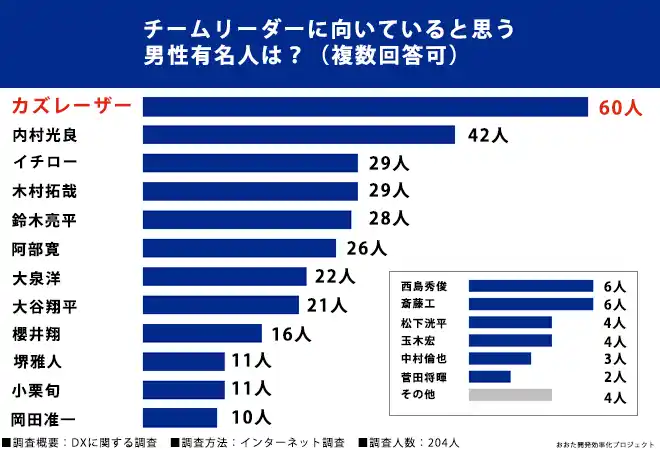 | 今回は、自動車業界に勤務する204名の男女を対象に「チームリーダーに向いていると思う男性有名人ランキング調査」を実施しました。 | ||||