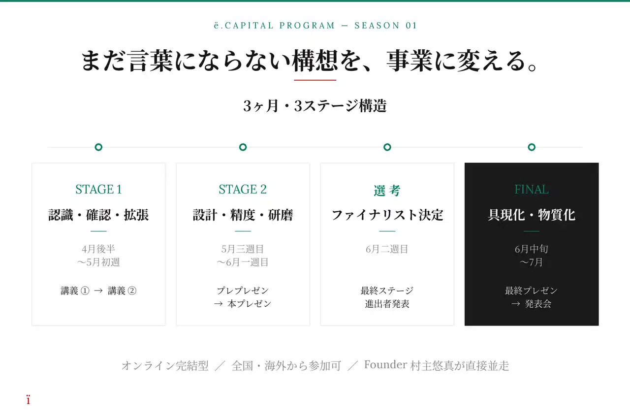 e.Capital Program は、その「まだ形になっていない構想」を出発点として受け入れ、参加者とともに事業として立ち上げていくプロセスそのものを投資対象とします。Founder 村主悠真自身が講義・フィードバック・最終選考・出資判断のすべてに関与し、3ヶ月かけて構想を実装段階まで引き上げます。 |