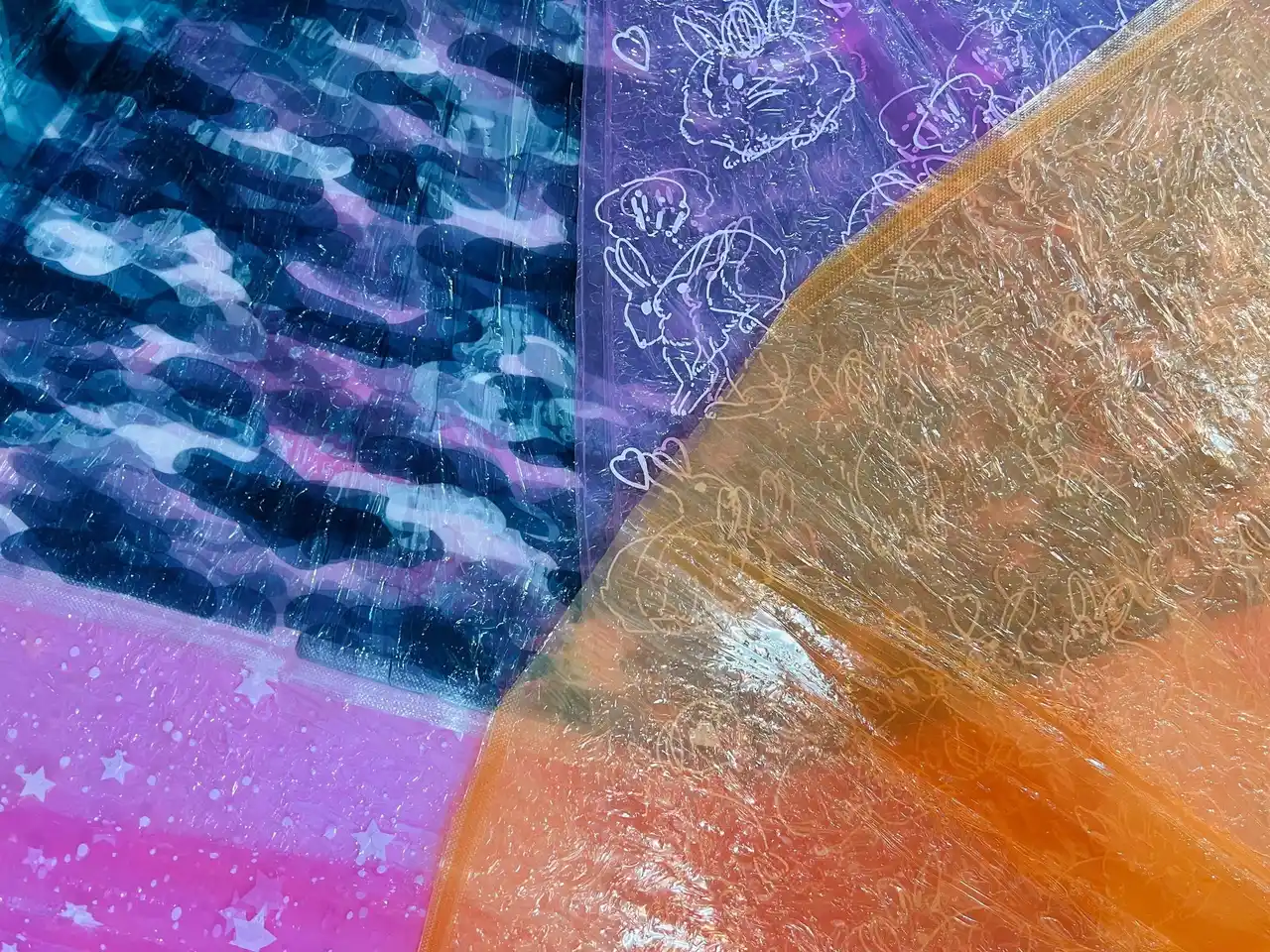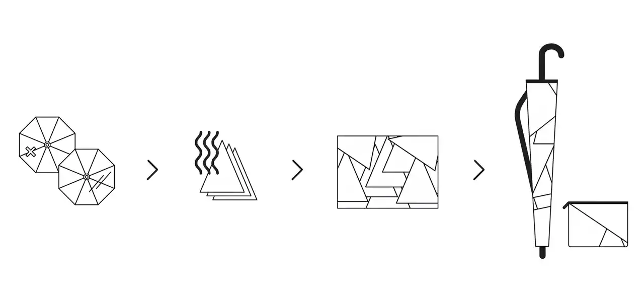 複数の傘生地を重ね、熱と圧力をかけて一枚の新しい生地へと再生する過程で、異なる色や柄が混ざり合い、予期せぬ模様が生まれます。同じ製品を作ろうとしても、二度と同じ表情には出会えません。 |