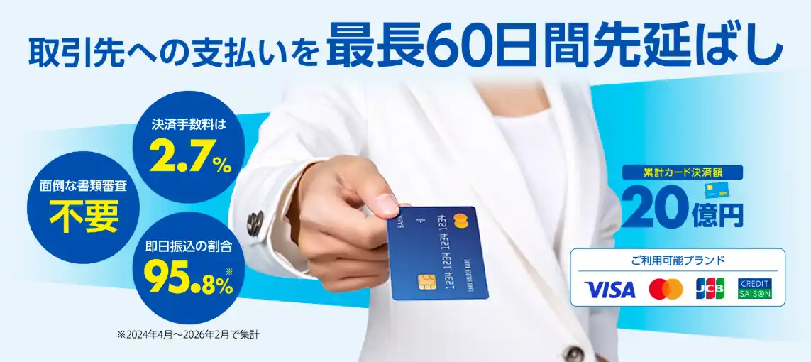 ご利用にあたって事前の書類審査などは不要で、Web完結で最短即日で取引先への振込が可能です。仕入れ、外注費、家賃、広告宣伝費や、法人向けの社会保険料や労働保険料の支払いなど、幅広いビジネスシーンに対応しています。 |