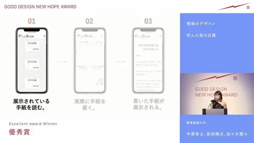 死んだ母の日展は、2022年に初開催されました。初年度はオンライン展示に加え、渋谷で白いカーネーション1,059(てんごく)本を配布し、サイト上には多数のメッセージが寄せられました。また、この年にはGOOD DESIGN NEW HOPE AWARD 2022にて優秀賞を受賞し、企画の社会的意義と表現性が高く評価されました。 |