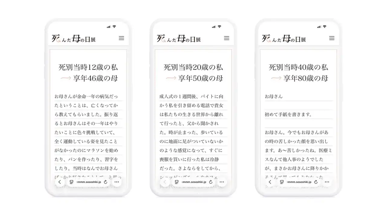 「死んだ母の日展」は、天国のお母さんへ宛てた手紙を匿名で投稿・公開できるオンライン展示プラットフォームです。参加者は、亡き母への思いを手紙として綴り、オンライン上に投稿することができます。 |
