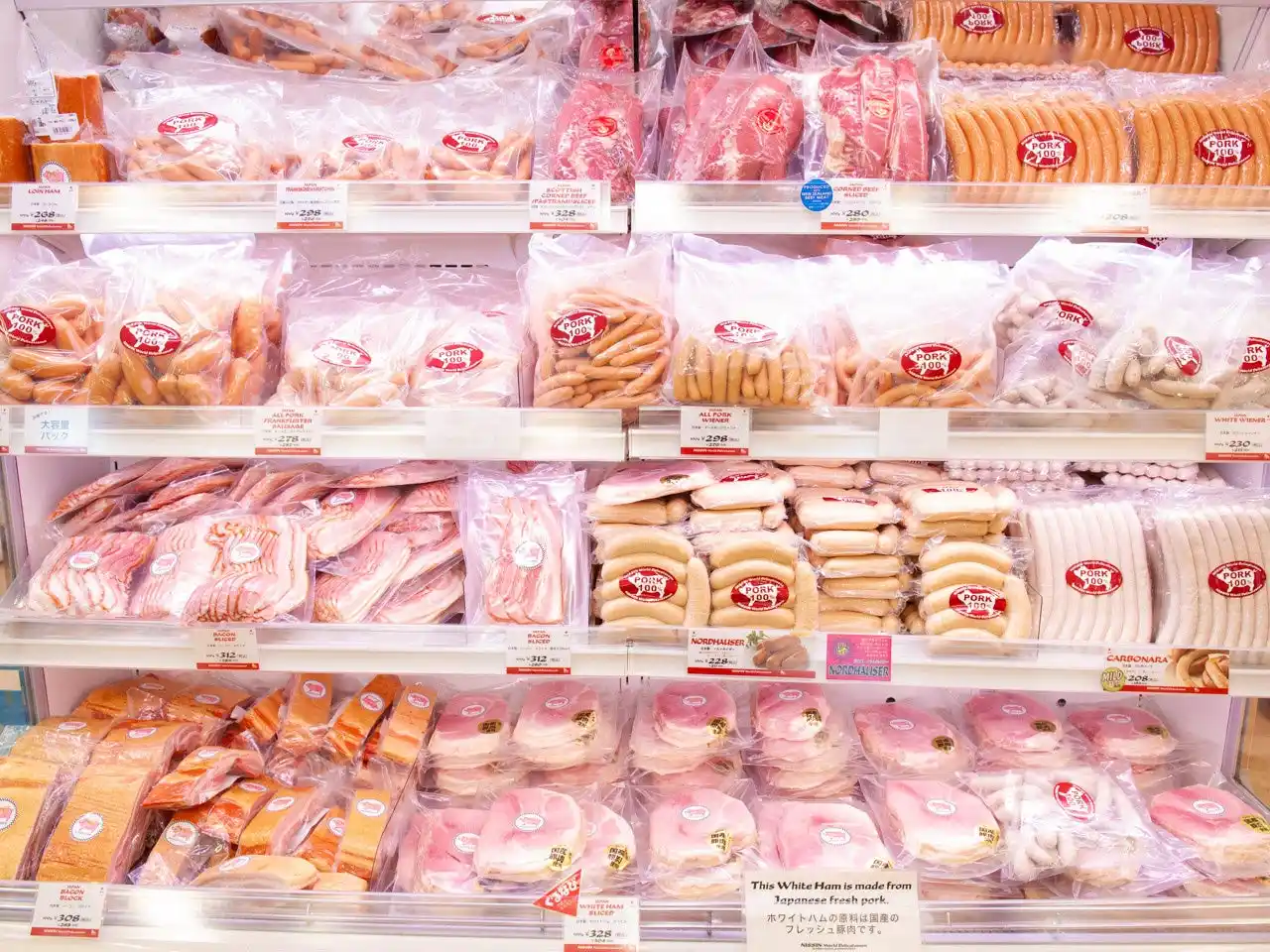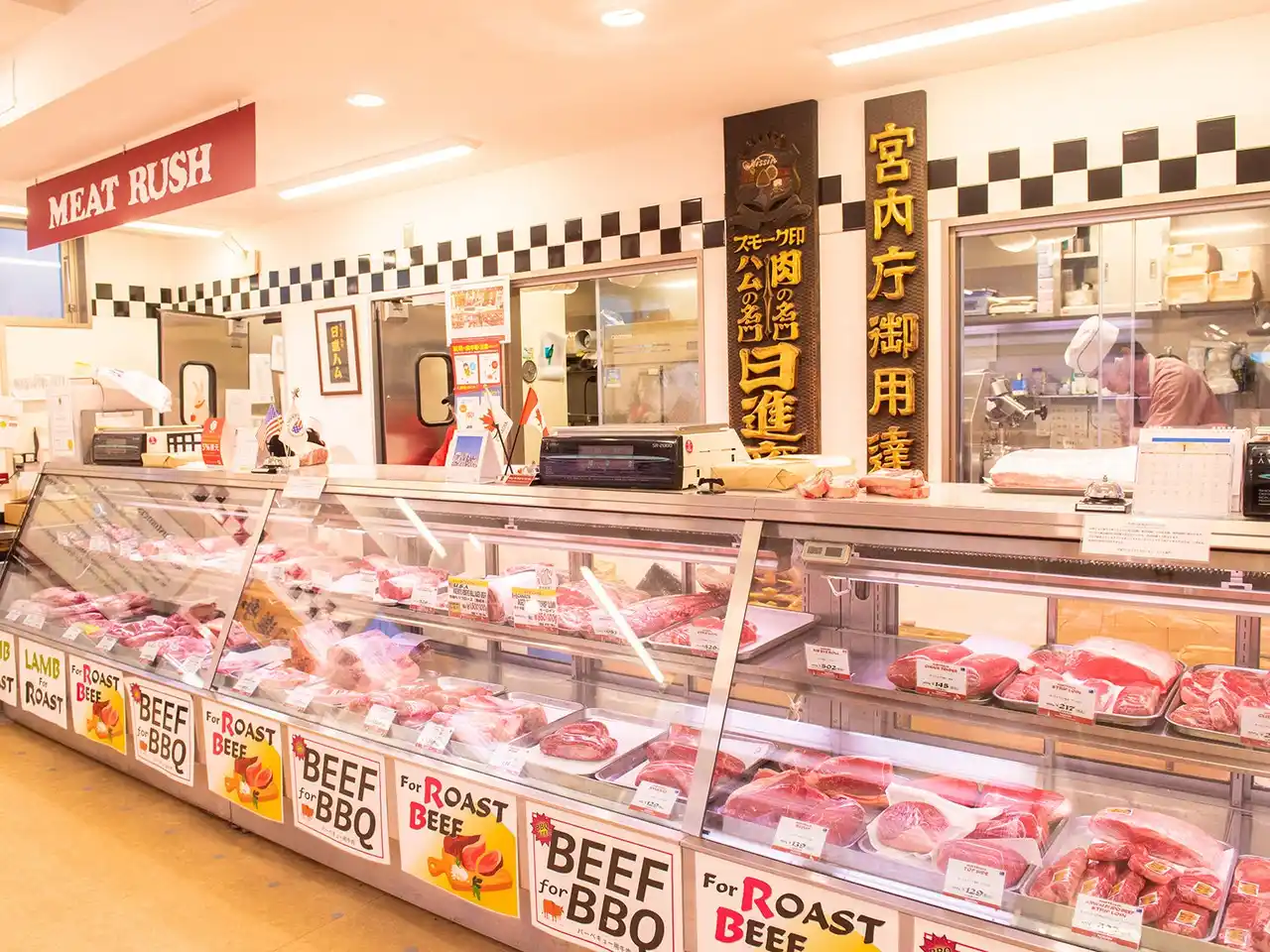 精肉・リカー・青果・グロサリーなど、日本のスーパーではあまり見ない海外向け商品も取り揃え、国際色豊かな空間です |