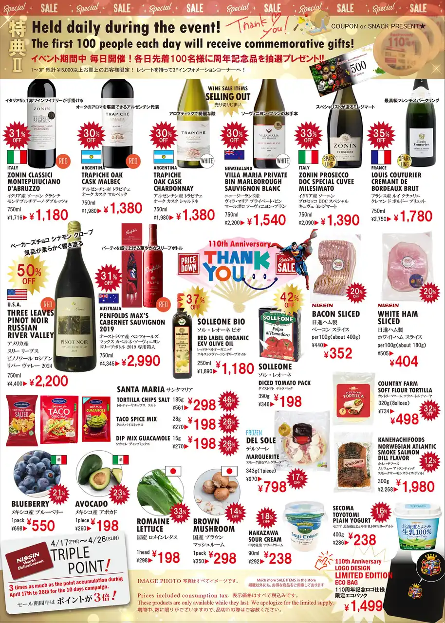 目玉商品として、お店の特色である「黒毛和牛」「通常販売していない周年セール限定のオーストラリア産サーロイン」「日進ハムスペシャルパック」「各国人気のワイン」などを特別価格で提供いたします。また、さまざまな食品メーカーによる試食会も店内で開催されます。 |
