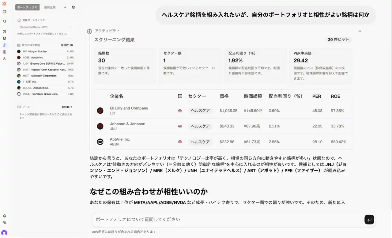 たとえば、「ヘルスケア銘柄を組み入れたいが、自分のポートフォリオと相性がよい銘柄は何か」という問いに対し、"会話するだけ"で投資に必要な情報にアクセスでき、意思決定の負担を軽減します。 |