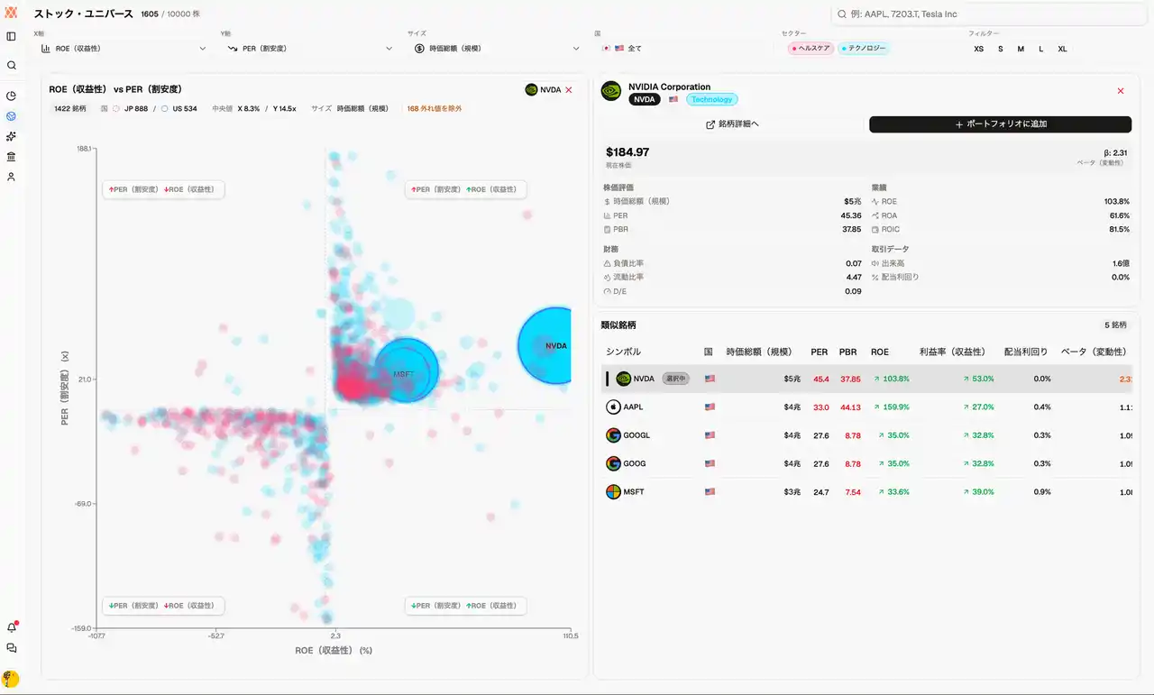 「どの銘柄を買うべきかわからない」という課題に対して、日本および米国上場銘柄の1万銘柄のデータを取得し、業績や各種指標(ROE、PBRなど)を可視化します。保有銘柄や検討中の企業が、市場の中で「どの位置にあるのか」を直感的に把握できるだけでなく、割安さや収益性の観点から、掘り出し物銘柄の発見を支援します。銘柄を“星”のように捉え、広大なマーケットを探索する体験を提供したいという想いから名付けた、Velpha独自のサービスです。 |
