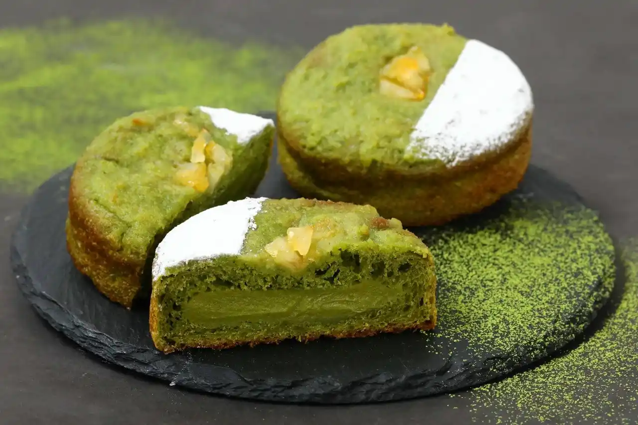 こだわり:すっきりとした抹茶の味わいを楽しめるブリオッシュ。抹茶を練り込んだ生地に、西尾の抹 |
