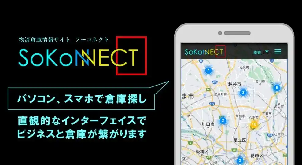 「SOKONNECT」(ソーコネクト)は、ビジネスと倉庫をシームレスに結ぶ、地図上で直感的に倉庫を探せるインターフェイスを備えた物流倉庫情報サイトです。「地図を使ってシンプルに直感的に倉庫を探せる」「倉庫とお客様のビジネスを繋ぐ」をコンセプトに開発しました。「SOKONNECT」で見つかった倉庫は、その後の内覧調整から契約、さらに搬入計画まで、東京西濃運輸が一貫してサポートします。 |