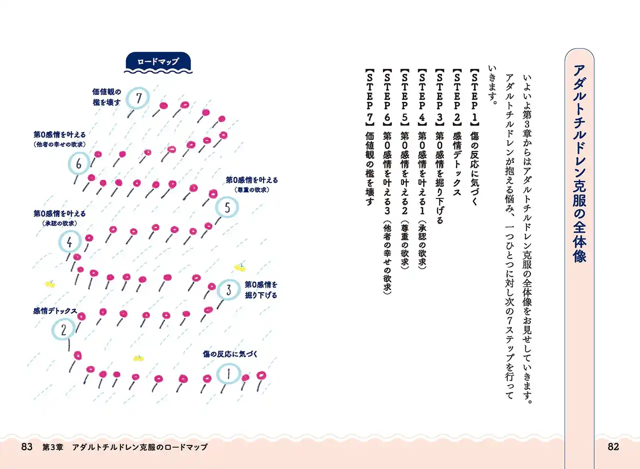 ・生きづらさの原因はセルフイメージの低下と価値観の傷 ・心の傷の正体は「承認」「尊重」「他者の幸せ」の不足 ほか 【2章】アダルトチルドレン大図鑑 あなたの悩みを全解析! ・悩みのメカニズムって実はシンプル ・アダルトチルドレンのお悩み大集合 ほか 【3章】アダルトチルドレン克服のロードマップ ・アダルトチルドレン克服の全体像 ・アダルトチルドレン克服に欠かせない内側の3人格 ほか 【4章】悩みは心の傷の反応。反応に気づき、心と悩みを解放しよう! ・克服ステップ1「傷の反応に気づく」 ・克服ステップ2「感情デトックス」 ほか 【5章】アダルトチルドレン克服 古い価値観・セルフイメージを脱ぎ捨て私らしく生きていく! ・克服ステップ3「第0感情を掘り下げる」 ・克服ステップ4「第0感情を叶える 承認の願い」 ・克服ステップ5「第0感情を叶える 尊重の願い」 ・克服ステップ6「第0感情を叶える 他者の幸せの願い」 ・克服ステップ7「価値観の檻を壊す」 |