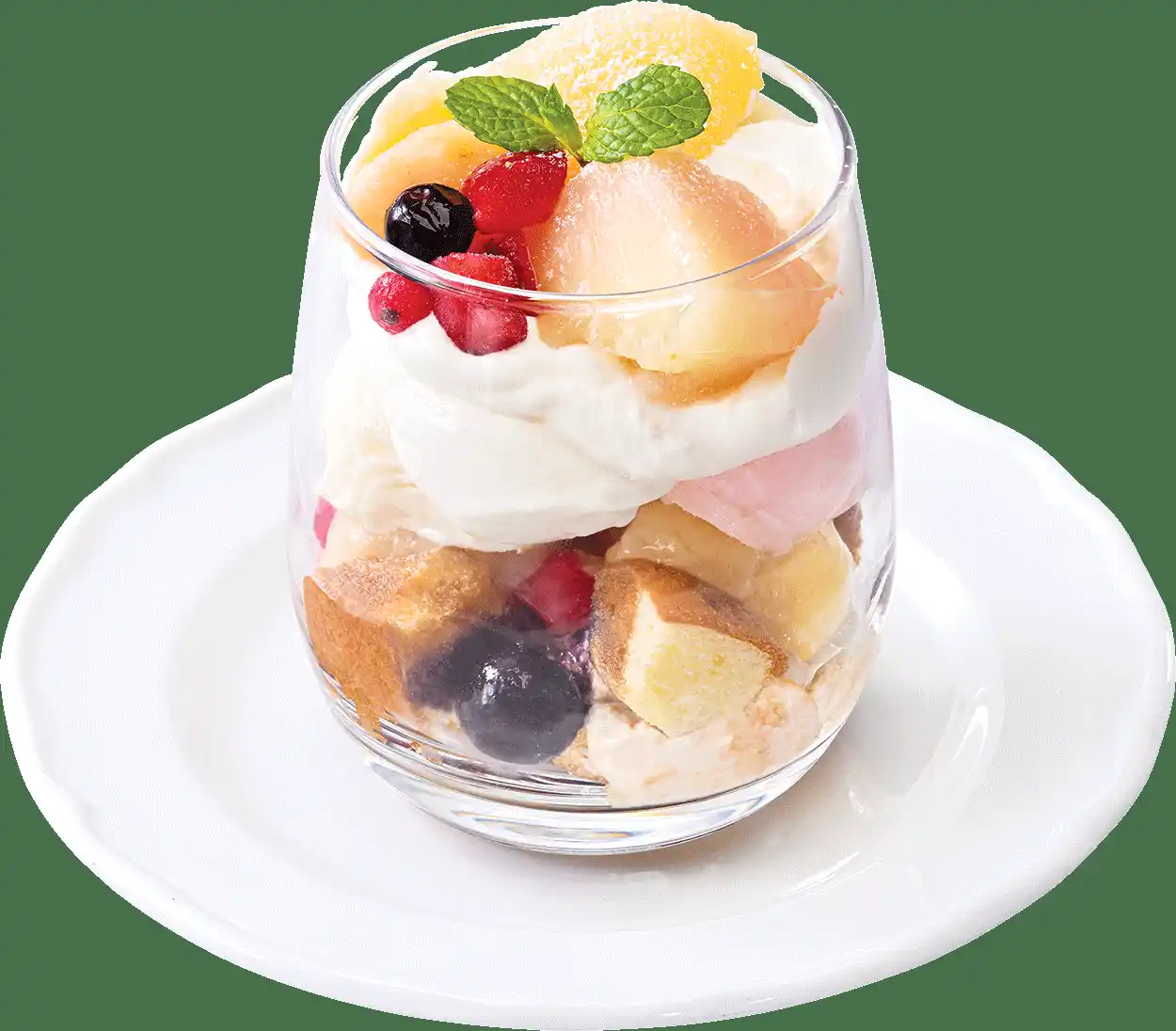 白桃の上品な甘さと紅茶の風味、チーズ風味のムースのコクが絶妙に調和した贅沢なドルチェです。白桃コンポートとミックスベリーの下に、白桃ソルベやチーズ風味のムース、香り豊かな紅茶シロップをたっぷり染み込ませたスポンジ、サクサクのメレンゲなどを重ねました。白桃コンポートはトップだけでなく中層にも使用しているため、最後まで白桃のおいしさを感じられます。色とりどりの具材が織りなす、多彩な味わいと可愛いらしい見た目にもご注目ください。 |