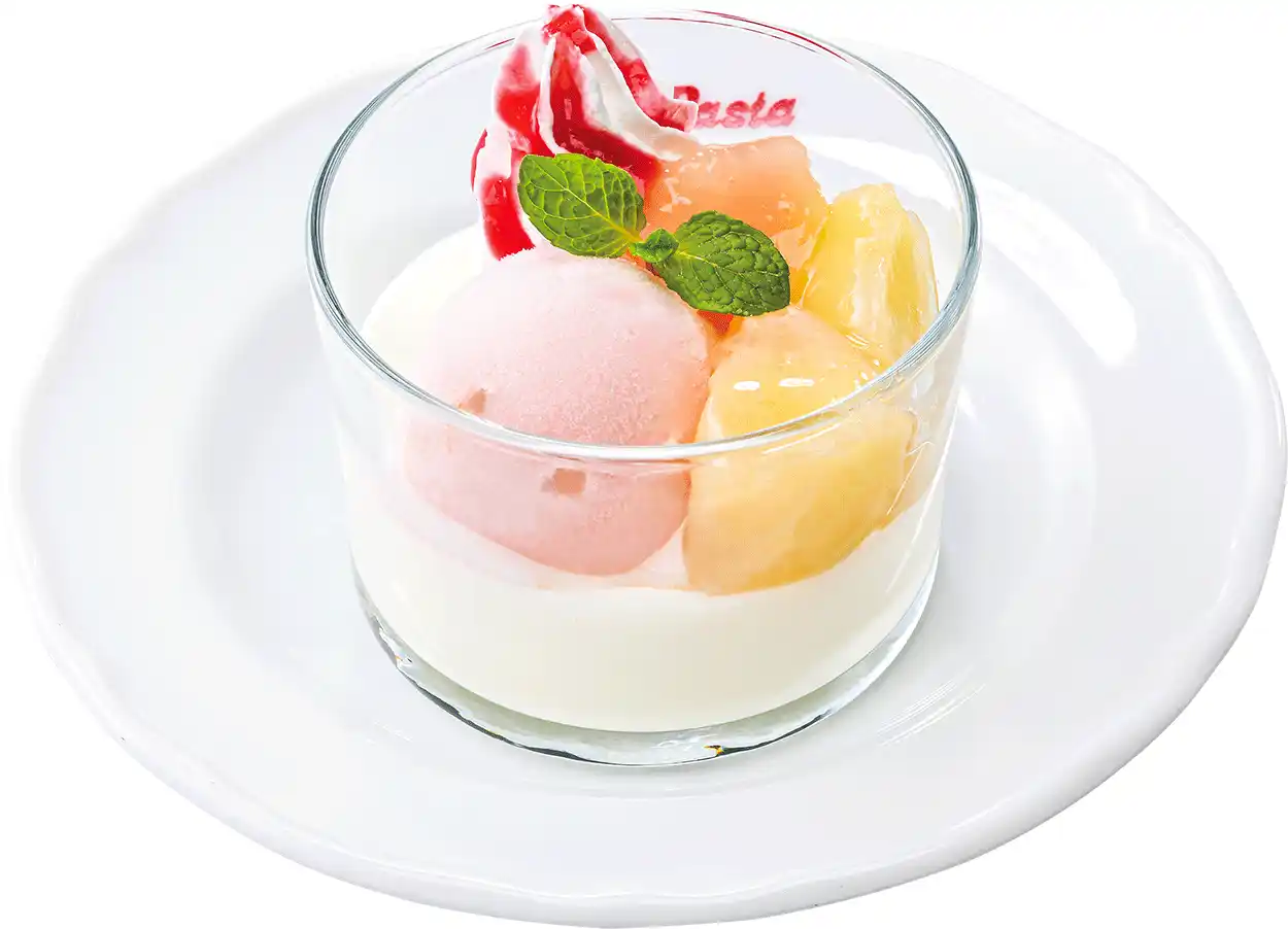 なめらかなパンナコッタに、白桃コンポートと白桃ソルベ、ホイップ、ラズベリーソースを合わせた、ミニサイズのグラスドルチェです。上品な甘さの白桃コンポートはすっきりとした白桃ソルベ、ミルキーなパンナコッタと相性抜群です。酸味のあるラズベリーソースが風味にアクセントを加えます。 |