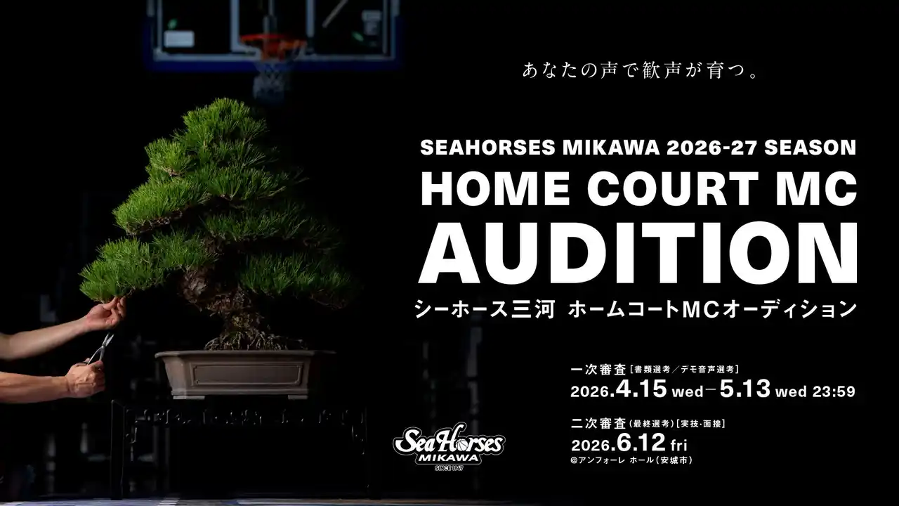 2026年2月に発表させていただきました通り、シーホース三河では、将来にわたって安定したアリーナ演出をお届けし続けるため、 2026-27シーズン以降を見据え、アリーナMC体制の充実に向けた準備を進めております。 |