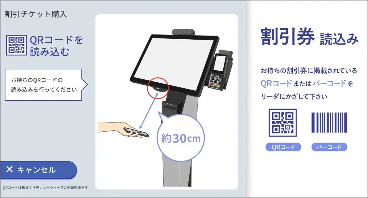 | 大型ディスプレイのタッチパネル型券売機。当日発券のほかオンライン事前購入のQRコード読み取りによる無人発券に対応。マルチリンガル(多言語)音声&表示やアニメーションガイドでインバウンド需要にも対応します。 | |||||||