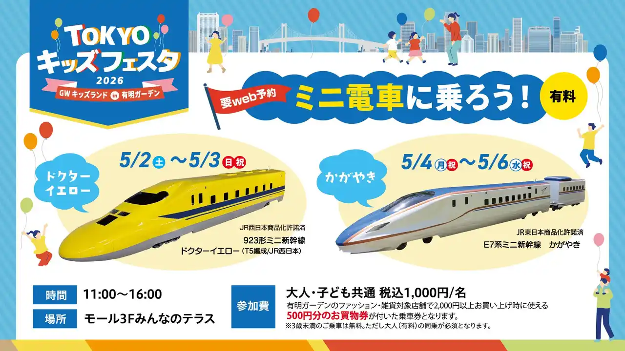 ゴールデンウィーク期間中、有明ガーデンでは、ミニ新幹線やJAFによる体験コンテンツ、ふわふわ遊具、スタンプラリーなど、ファミリーでお楽しみいただけるイベントを開催いたします。