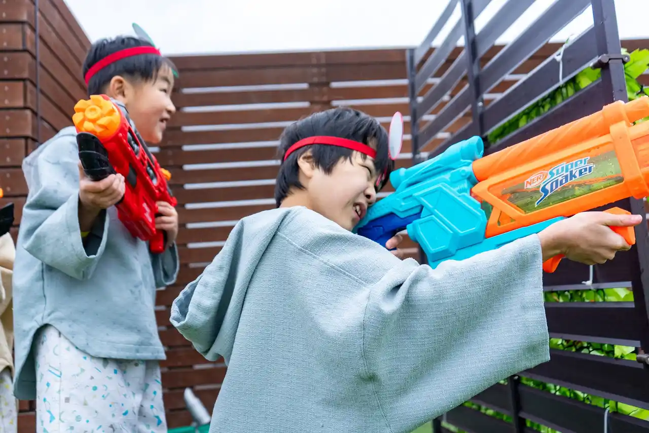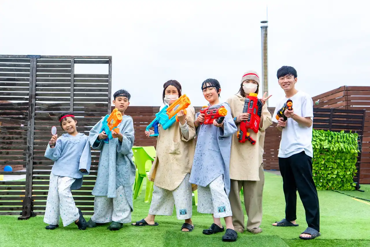 水鉄砲を使ったサバイバルゲームを、屋上フィールドで開催します。頭に付けた金魚すくいの「ポイ」を水鉄砲で狙い合う白熱のバトルです。フラッグ戦・殲滅戦・大将戦・バトルロワイヤル戦の4ルールから3つを選んで開催。3歳から大人まで全力で楽しめます。びしょ濡れになったあとは、そのままおふろへ直行してさっぱりどうぞ。 |