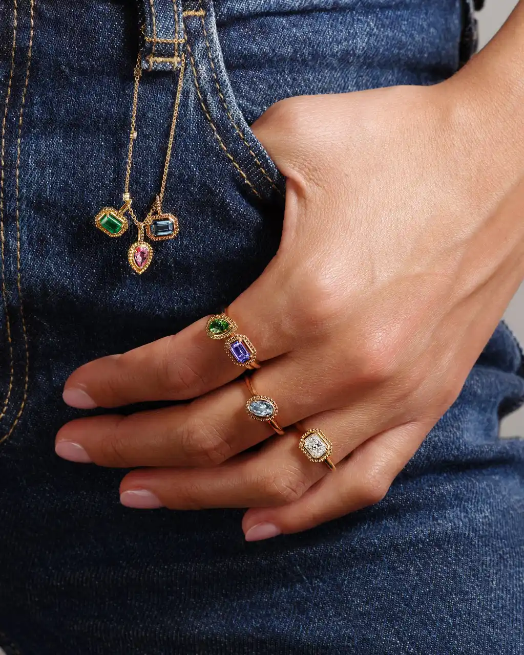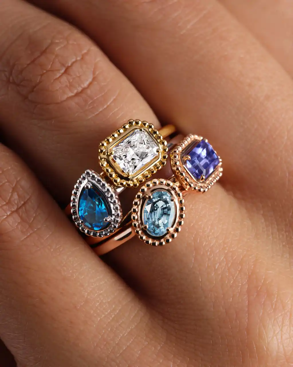 一つひとつのジュエリーは、多彩なカットやカラーのジェムを組み合わせることでオリジナルな佇まいを描くことができます。ペア、オーバル、オクタゴン、ラディアントなど、個性豊かなカットを纏うリングは、自らの歩みを静かに刻み、祝福し、そして「自分自身」をより確かなものにするシンボルとなるでしょう。 |