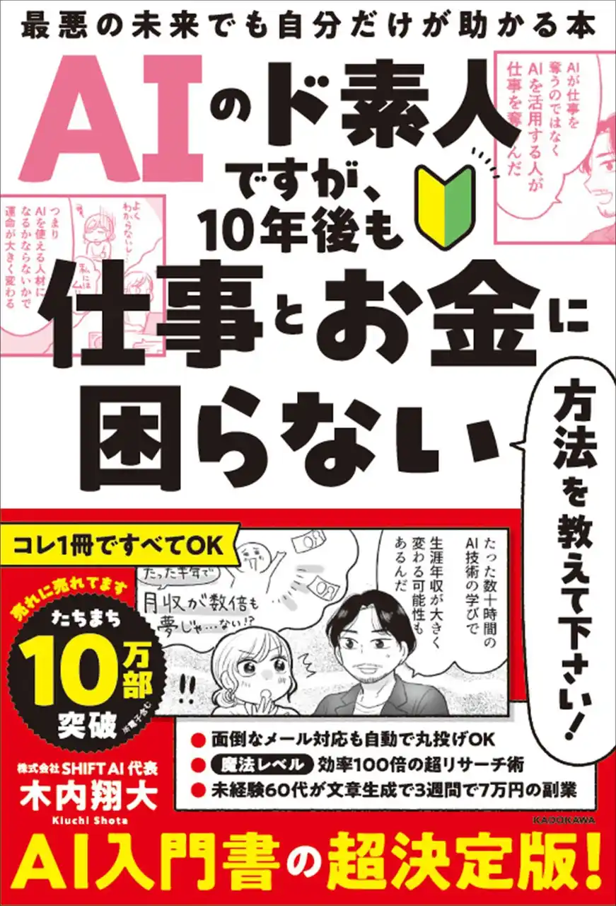 株式会社KADOKAWA(本社:東京都千代田区、取締役 代表執行役社長 CEO:夏野剛、以下KADOKAWA)は、木内翔大著『AIのド素人ですが、10年後も仕事とお金に困らない方法を教えて下さい! 最悪の未来でも自分だけが助かる本』が売れ行き好調につき、累計10万部を突破しました(電子版を含む)。本書は、全国の書店およびインターネット書店でお求めいただけます。 |