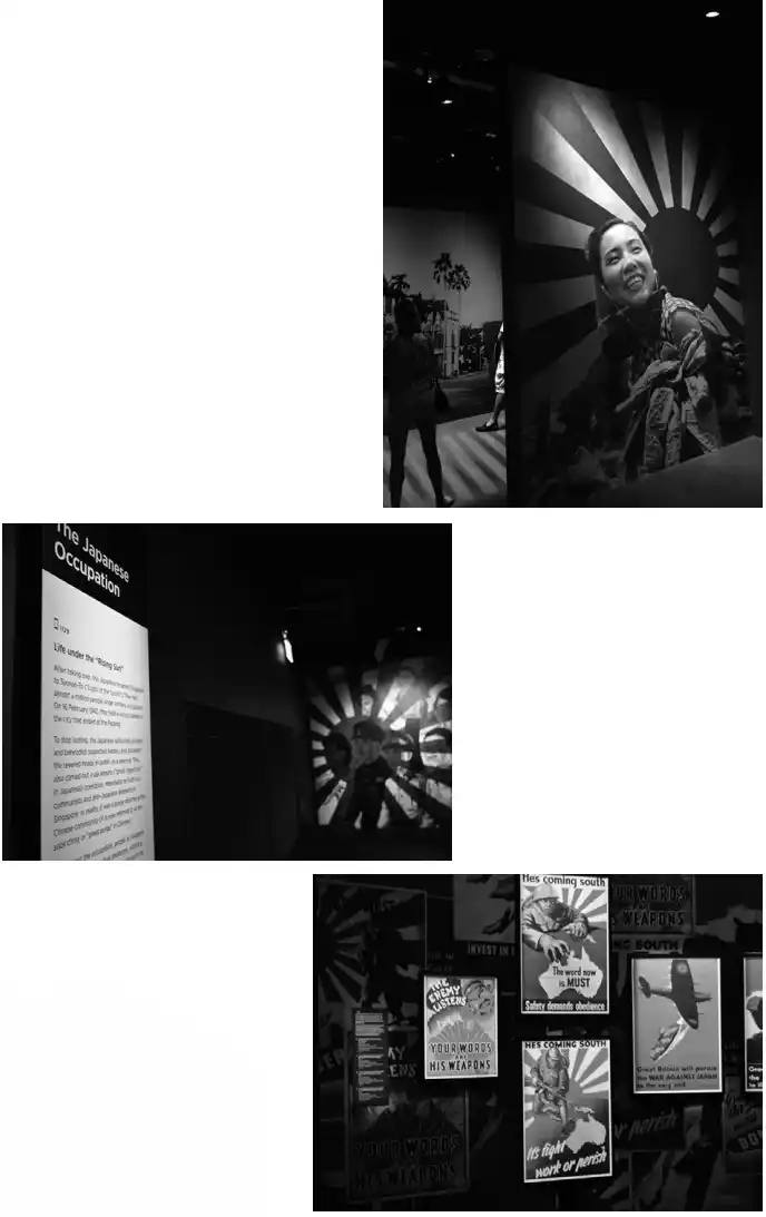 シンガポール国立博物館の多くの展示で、旭日旗が日本統治時代の象徴として、またその時代のプロパガンダのデザインとして使われていたことが強調されている |