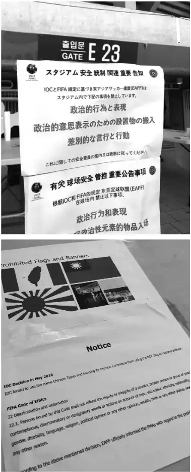 2019年、E-1 サッカー選手権会場入り口での掲示。台湾の独立旗や旭日旗の持ち込みが禁止されている |