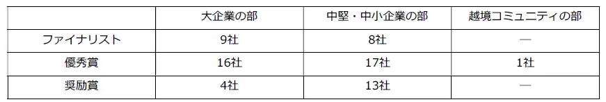 本年度は、従業員が1,000名以上の企業を「大企業の部」、1,000名未満の企業を「中堅・中小企業の部」、企業や個人の実践・探究型コミュニティを「越境コミュニティの部」として審査し、以下の通り入賞企業を選出しました。 |