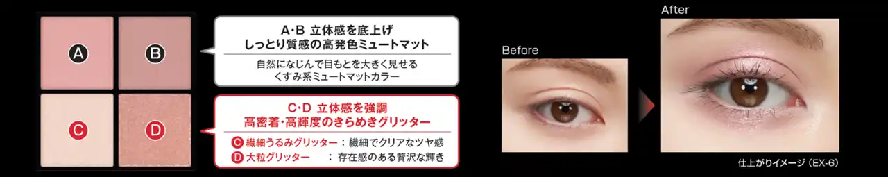 さらに、正反対の2つの質感コントラストでクリッと丸い目もと印象に仕上がる「ポッピングシルエットシャドウ」からは、淡いのに盛れるピンクグレージュカラーの限定色を数量限定で同日発売いたします。