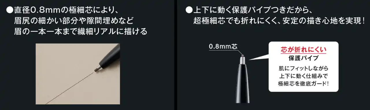 まるでシャーペンで描くようなリアルな毛流れ眉が完成。折れにくい0.8mmの超極細芯“眉シャーペン”から、使いやすいダーク系の新色登場。 |