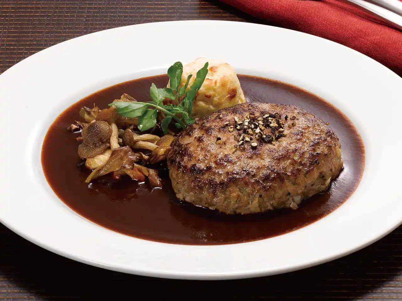 クラシックテイストの合挽ハンバーグに大葉と大根おろしをトッピングした和風ハンバーグ。おろし醤油ソースでお楽しみください。 |