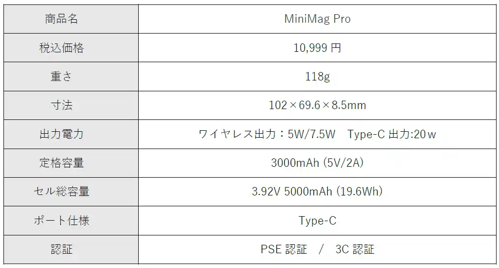 「MiniMag Pro」は、従来の液状リチウム電池の課題であった「熱」と「安全」を克服した、プロ仕様のマグネット式モバイルバッテリーです。 |