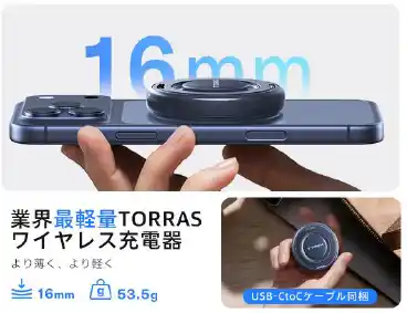 最新規格Qi2.2に対応し、30分で最大60%の充電が可能。TORRAS製の45W電源アダプターと専用ケーブルを同梱しているため、購入後すぐにフルスペックでの充電が可能です。 |