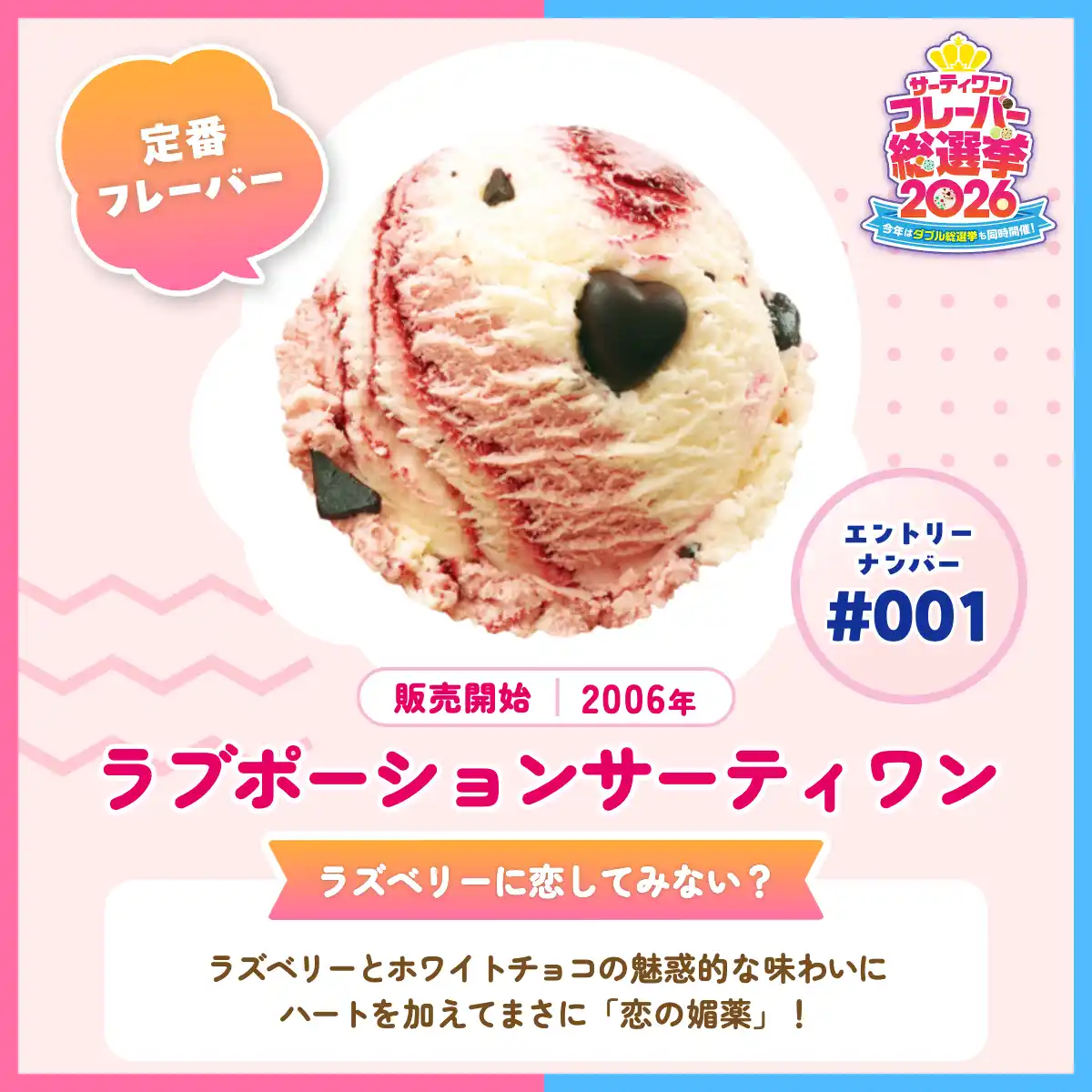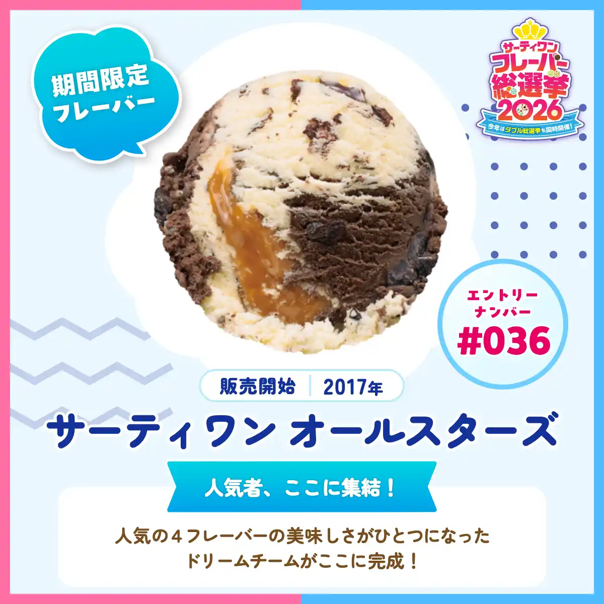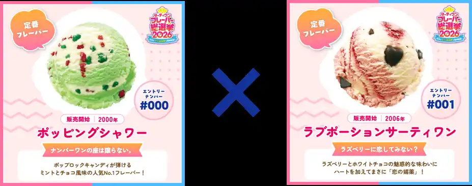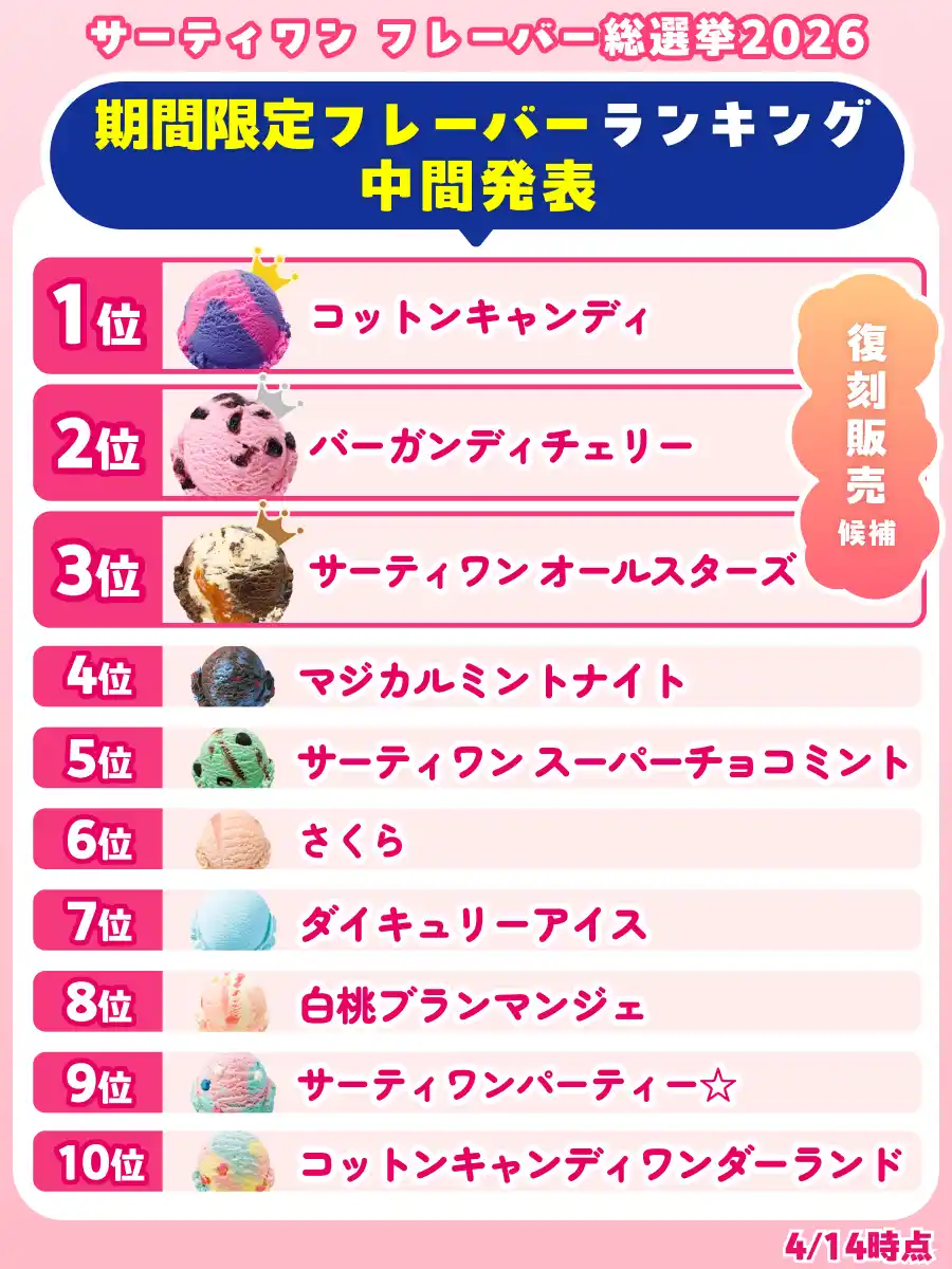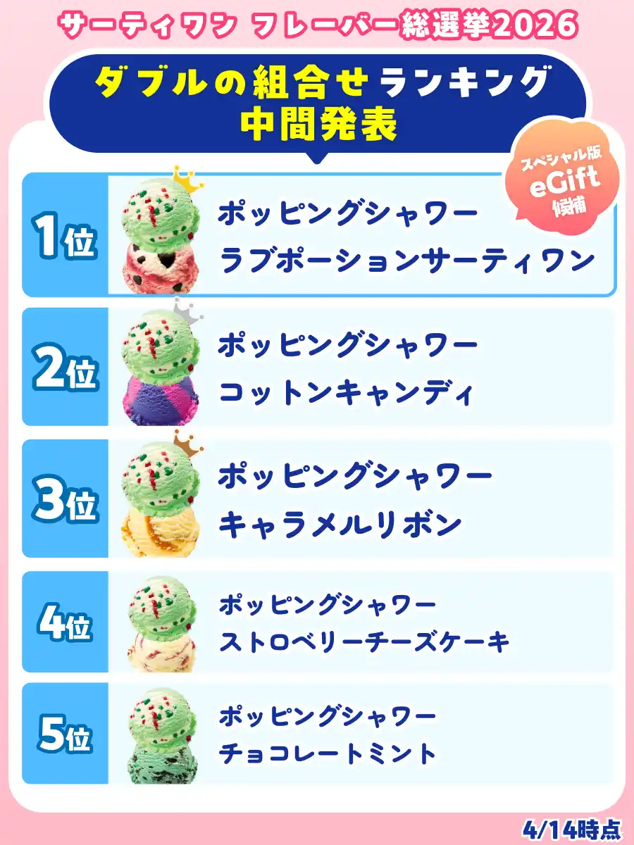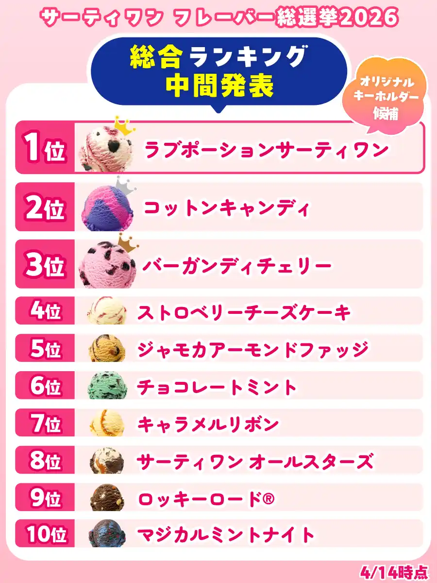 B-R サーティワン アイスクリーム株式会社(所在:東京都品川区上大崎3-1-1/代表取締役会長兼社長 CEO ジョン・キム:東京証券取引所(スタンダード市場):2268)は、「サーティワン フレーバー総選挙2026」を開催しています。これまで開発してきた1,400種類のオリジナルフレーバーの中から、珠玉の100種がエントリーし、昨年を上回る投票ペースで大きな盛り上がりを見せています。4/14(火)時点の暫定順位は下記の通りです。 |