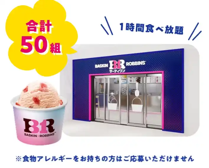 フレーバー総選挙・ダブル総選挙の両方へ投票いただいた方の中から、抽選で50組100名様に、サーティワン貸し切り食べ放題イベントへご招待いたします!後半戦からの参加でもまだまだ当選のチャンスはありますので、奮って投票ください。 |