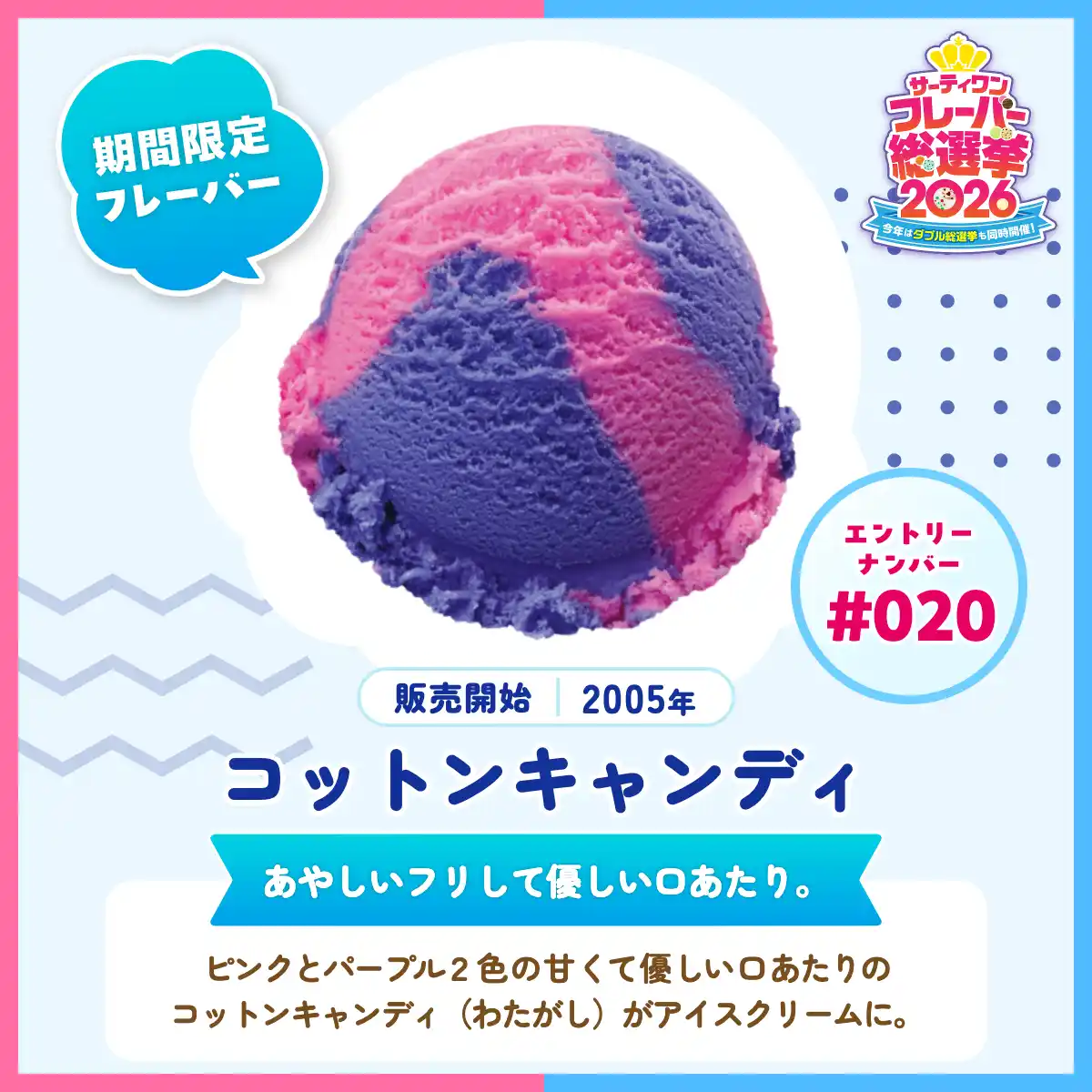 復刻販売をかけた期間限定フレーバーランキングでは、1位コットンキャンディ、2位バーガンディチェリーと続き、サーティワン オールスターズが前回の9位から躍進し上位3位にランクイン。前回、前々回の総選挙では、1位バーガンディチェリー、2位コットンキャンディという結果でしたが、今回はコットンキャンディがついに初のNo.1に輝くのか注目が集まります。 |