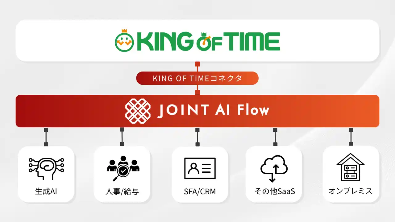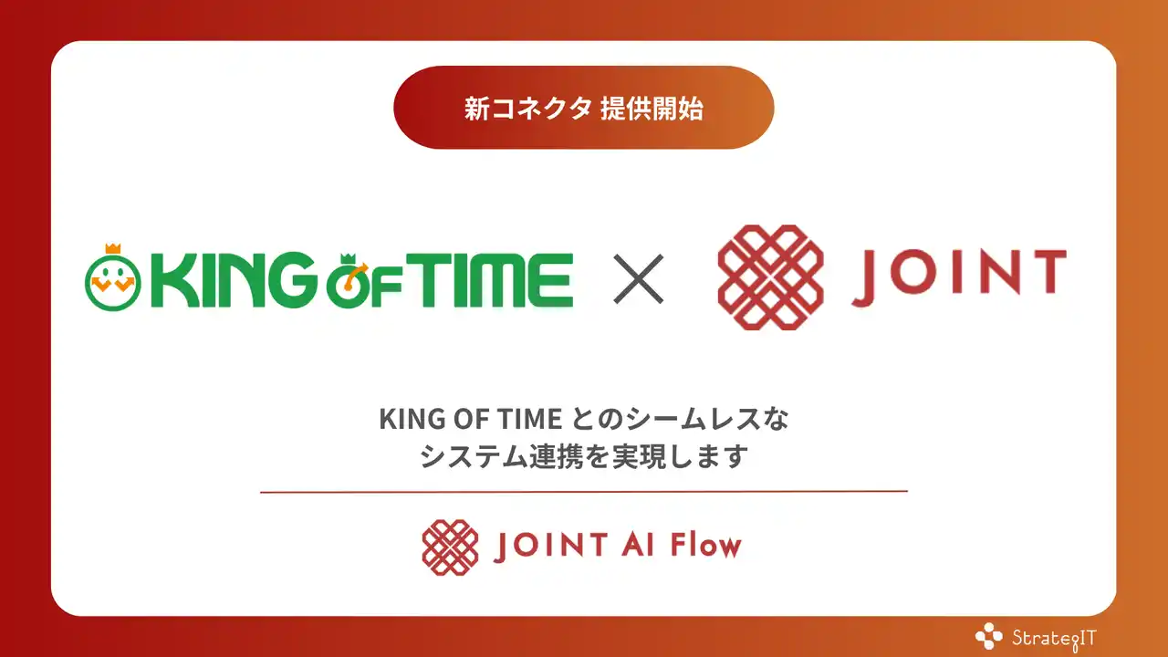 株式会社ストラテジット(本社:東京都港区、代表:加藤 史恵、以下当社)は、生成AI×業務システム連携プラットフォーム「JOINT AI Flow」において、株式会社ヒューマンテクノロジーズ(本社:東京都港区、代表:家崎 晃一)が提供するクラウド勤怠管理・人事給与システム「KING OF TIME」とのコネクタ提供を開始しました。 |
