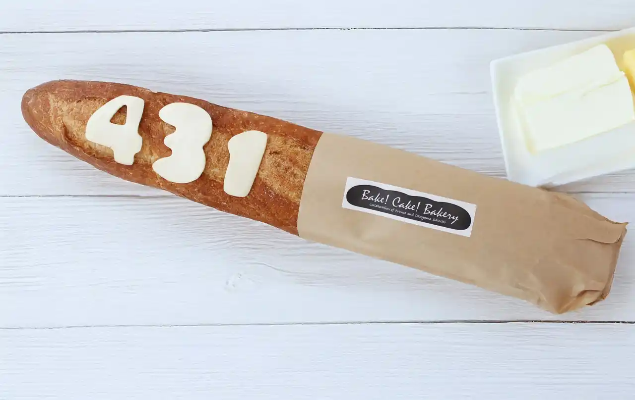 ● 431 よいみちブレッド 道をイメージしたバゲットに「431」を象ったチーズをあしらい、新しい道の誕生を表現。 |