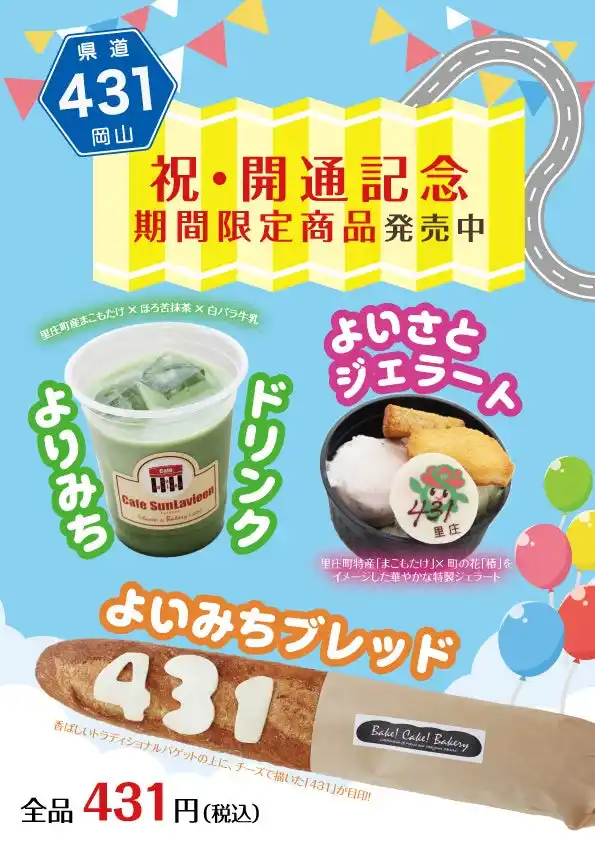 株式会社サンラヴィアン(本社:岡山県浅口郡里庄町、代表取締役:占部守弘)は、岡山県が整備を進めてきた岡山県道431号 六条院東里庄線の一部区間の開通にあわせ、期間限定イベント「431号開通記念 よいさと・よいみち・よりみちフェア」を2026年4月14日(火)から5月6日(水)まで、本社併設の直営店アウトレットショップ「カフェ・サンラヴィアン」にて開催しています。 |