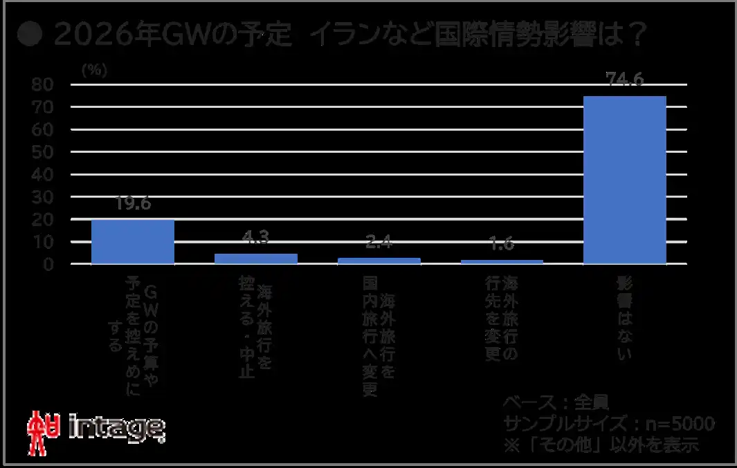 ・イラン情勢の影響で「GWの予算・予定を控えめにする」と回答した人は19.6%。海外旅行も一定層が慎重姿勢