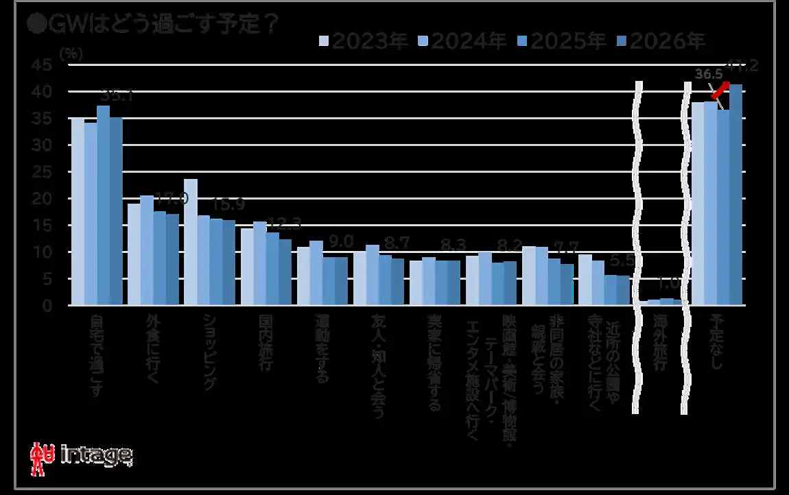 ・GWの予定は総じて減少し、「予定なし」が41.2%と前年から増加。物価高に加え、“様子見”層が拡大か |