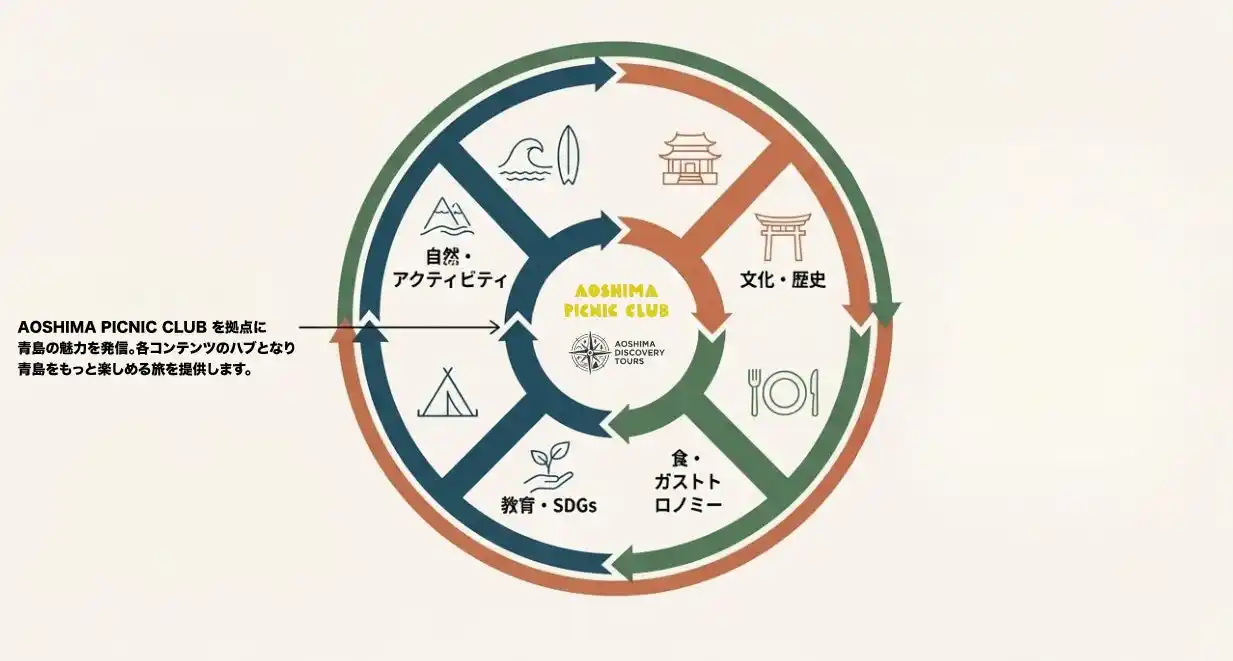 株式会社Libertyship(以下、当社)の運営する「AOSHIMA PICNIC CLUB」を拠点に、「自然・アクティビティ」「文化・歴史」「食・ガストロノミー」「教育・SDGs」 |