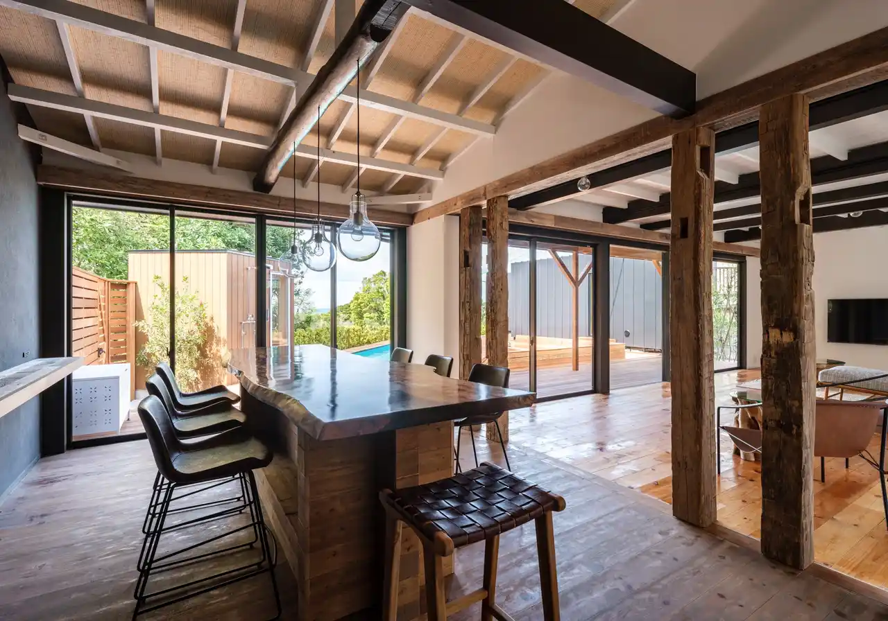 自社企画の木造トレーラーハウスを2棟設置。天井に木の梁をあらわしにした温もりのある空間で、トレーラーハウスとは思えない居心地を実現。母屋との統一感を保ちながら、海辺のトーンと古材の重厚感という2パターンの内装をデザインしています。 |