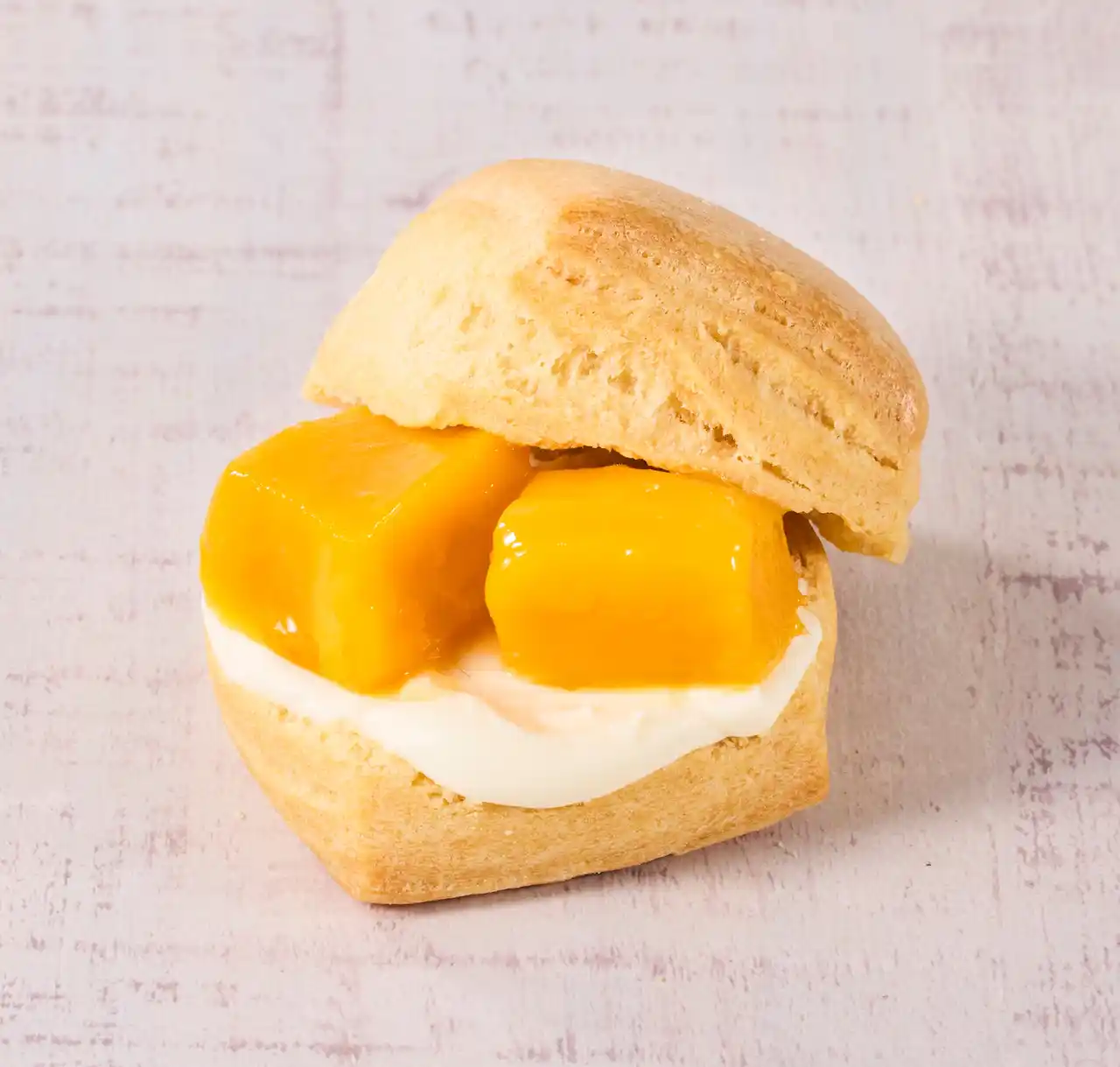 | 今回、期間限定で登場するのは、マンゴーとクリームチーズをサンドしたスコーンサンド。温かいスコーンに、ひんやりマンゴーを合わせ、温×冷のコントラストが楽しめる新感覚の味わいに仕上げました。とろけるような濃厚な甘みと豊かな香りが特長の「アップルマンゴー」を使用。時間の経過とともにマンゴーの温度や食感が変化し、ひと口ごとに異なる美味しさをお楽しみいただけます。春にぴったりの爽やかな味わいが、気分まで軽やかにしてくれる一品です。 | ||||
